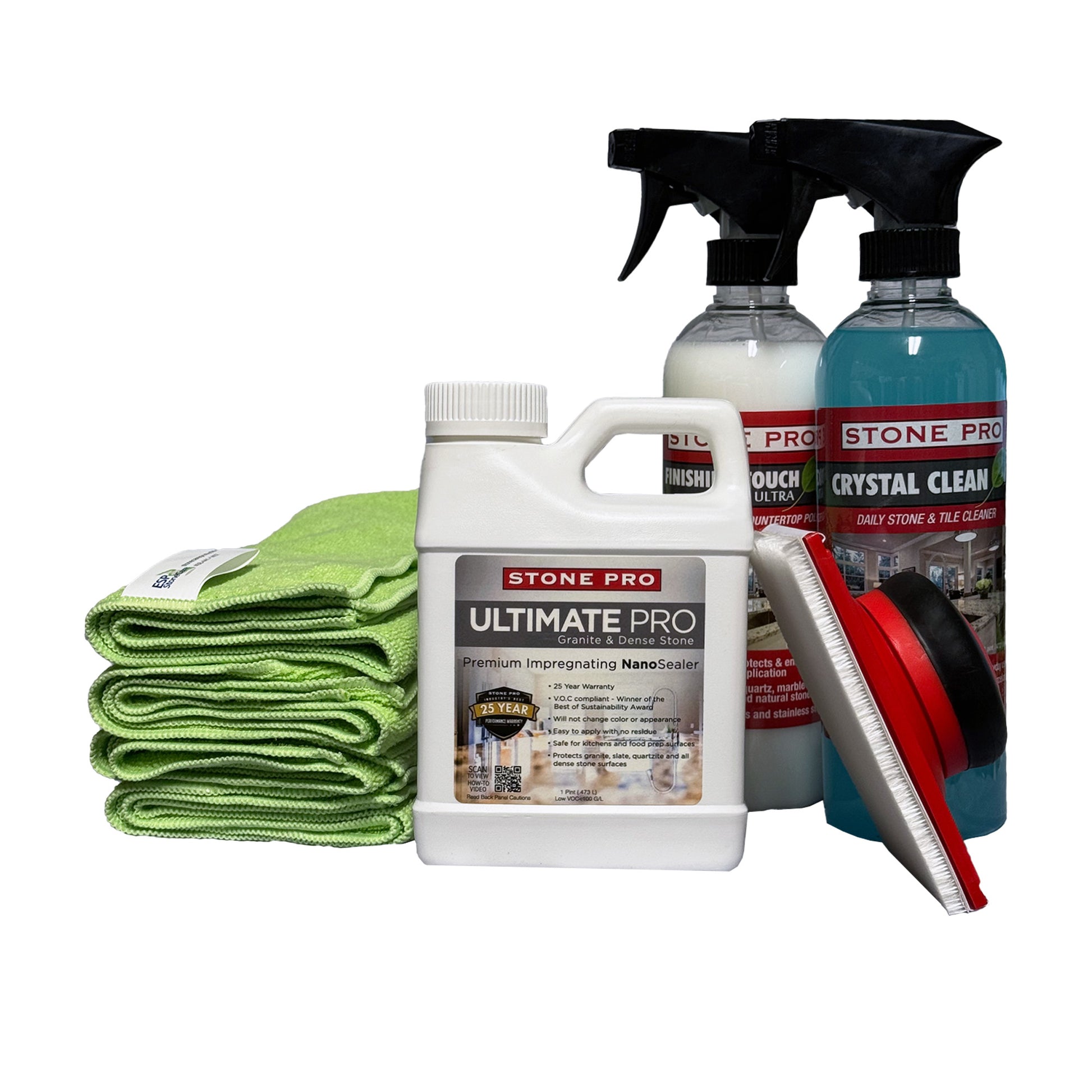 Protect your granite, quartzite, slate, and other dense stone surfaces with this comprehensive stone sealer bundle. The Ultimate Pro Stone Pro Bundle combines a powerful penetrating sealer and a high-quality solvent-based sealer to provide unparalleled protection against stains, etching, and wear. The penetrating sealer fortifies the stone from within, while the solvent-based sealer forms a durable barrier on the surface. This dynamic duo ensures your stone countertops, floors, and surfaces maintain their natural beauty for years to come. With superior coverage and easy application, this bundle simplifies the process of preserving your investment. Revitalize the vibrant colors and enhance the richness of your stone's unique character with this professional-grade sealing system. Suitable for indoor and outdoor use, it offers long-lasting protection against water, oil, and other common household spills. Elevate the elegance of your space with the Ultimate Pro Stone Pro Bundle.