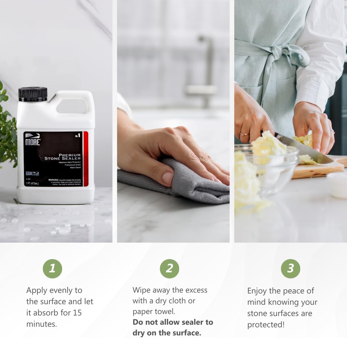 - CLEAN INGREDIENTS - Made with just four ingredients, MORE Premium Stone Sealer is low odor and unscented. Our water-based formula has less impact on indoor air quality so it can be used worry-free on stone surfaces anywhere around your home.